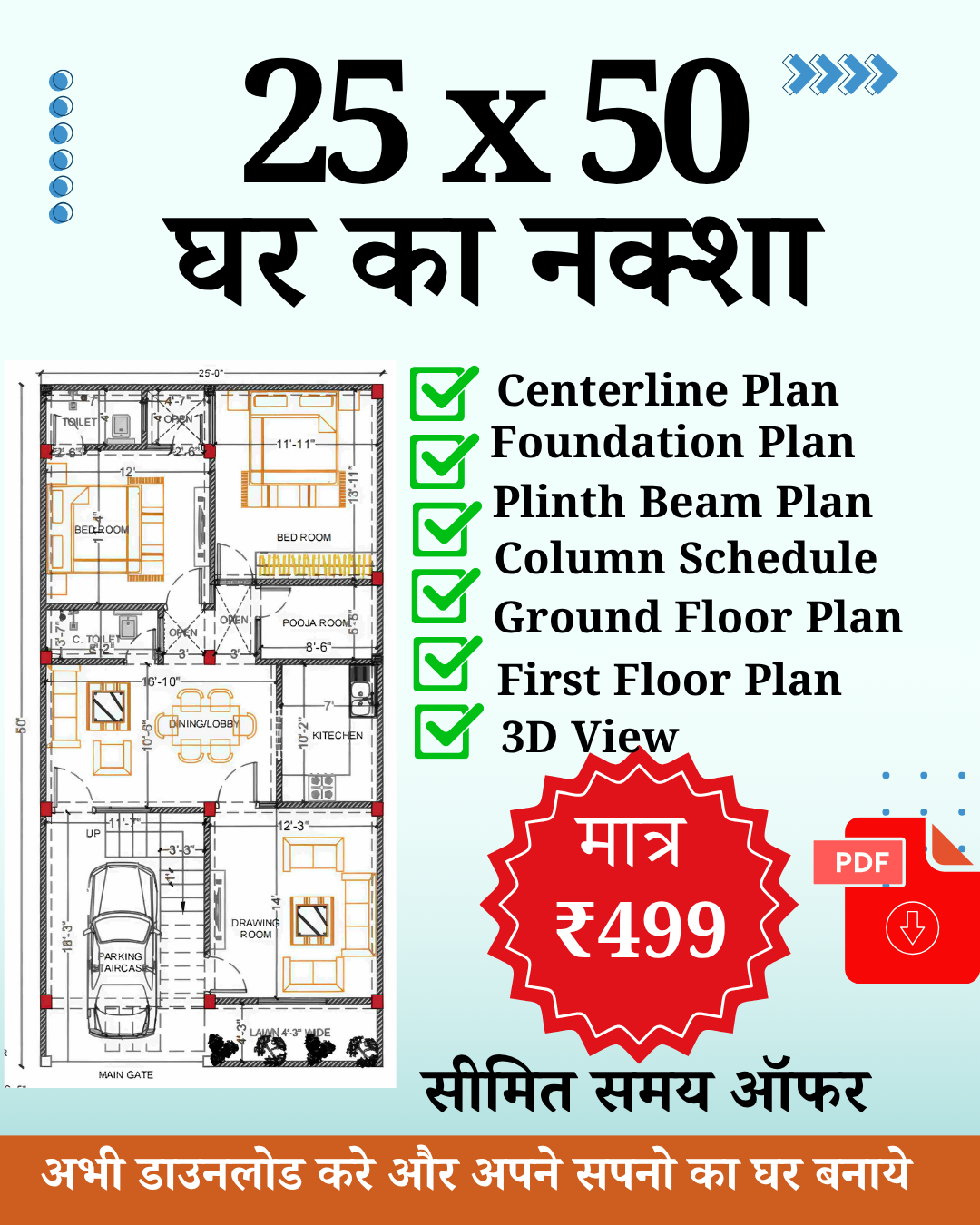 Be the first to review “25×50 Best House Plan PDF Package (Centerline, Foundation, Plinth Beam, G+1 Floor Plans + 3D Elevation)” Cancel reply